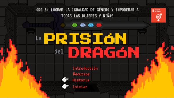 Cuenta la leyenda que un reino oculto forjó una espada que junto con el poder de las Gemas Elementales (fuego, agua, aire y tierra) podía derrotar a cualquier mal. Reúne las gemas con tus conocimientos de SDG 5 para completar el arma definitiva y derrotar al dragón que se esconde en la mazmorra.