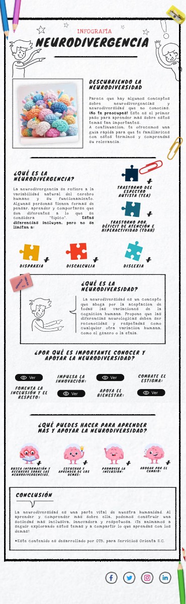 La neurodiversidad es una parte vital de nuestra humanidad. Al aprender y comprender más sobre ella, podemos construir una sociedad más inclusiva, innovadora y respetuosa. ¡Te animamos a seguir explorando estos temas y a compartir lo que aprendas con los demás! *Este contenido es desarrollado por OTB, para Servicios Orienta S.C.