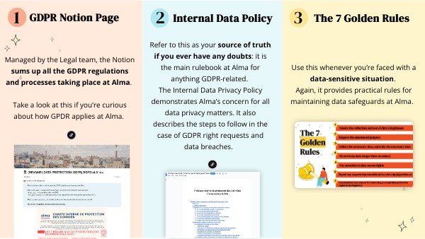 Refer to this as your source of truth if you ever have any doubts: it is the main rulebook at Alma for anything GDPR-related. The Internal Data Privacy Policy demonstrates Alma’s concern for all data privacy matters. It also describes the steps to follow in the case of GDPR right requests and data breaches.