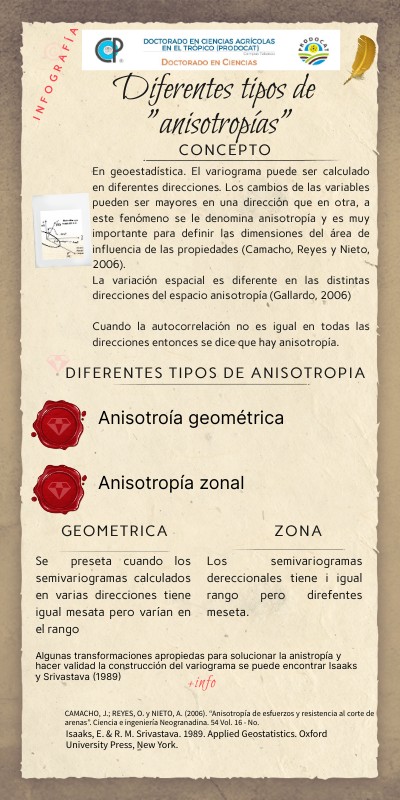 En geoestadística. El variograma puede ser calculado en diferentes direcciones. Los cambios de las variables pueden ser mayores en una dirección que en otra, a este fenómeno se le denomina anisotropía y es muy importante para definir las dimensiones del área de influencia de las propiedades (Camacho, Reyes y Nieto, 2006). La variación espacial es diferente en las distintas direcciones del espacio anisotropía (Gallardo, 2006) Cuando la autocorrelación no es igual en todas las direcciones entonces se dice que hay anisotropía.