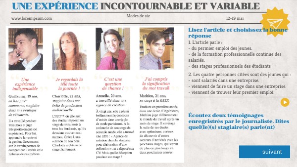 - l'appréciation de Guillaume sur son stage ;- comment Charlotte a décroché son stage ; - comment Armelle est entrée dans une écoles de mode ; - l'appréciation de Mathieu sur le monde du travail.