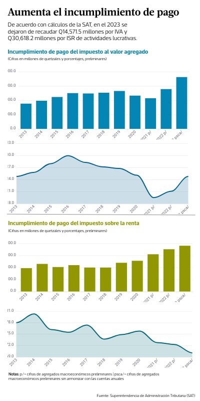 De acuerdo con cálculos de la SAT, en el 2023 se dejaron de recaudar Q14,571.5 millones por IVA y Q30,618.2 millones por ISR de actividades lucrativas.
