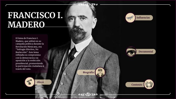 Francisco I. Madero fue una figura central en la Revolución Mexicana y sirvió como presidente de México de 1911 a 1913. Aquí tienes una breve infografía sobre su vida y legado: *Nombre Completo:* Francisco Ignacio Madero González *Fecha de Nacimiento:* 30 de octubre de 1873 *Lugar de Nacimiento:* Parras de la Fuente, Coahuila, México *Fecha de Fallecimiento:* 22 de febrero de 1913 *Profesión:* Político, empresario y escritor *Partido Político:* Partido Nacional Antirreeleccionista