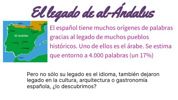 El español tiene muchos orígenes de palabras gracias al legado de muchos pueblos históricos. Uno de ellos es el árabe. Se estima que entorno a 4.000 palabras (un 17%)