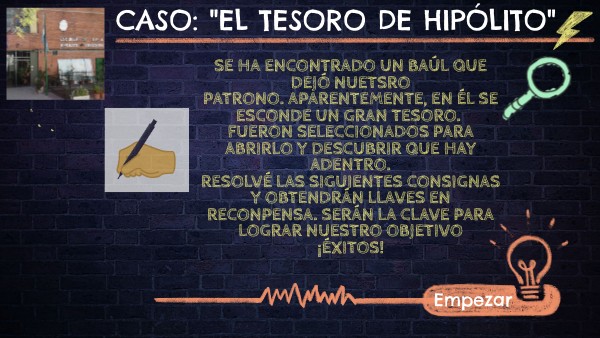 sE HA ENCONTRADO UN BAÚL QUE DEJÓ NUETSRO PATRONO. aPARENTEMENTE, EN ÉL SE ESCONDE UN GRAN TESORO. fUERON SELECCIONADOS PARA ABRIRLO Y DESCUBRIR QUE HAY ADENTRO. rESOLVÉ LAS SIGUIENTES CONSIGNAS Y OBTENDRán llaves EN RECOmPENSA. SERÁN LA cLAVE PARA LOGRAR NUESTRO OBJETIVO ¡éXITOS!