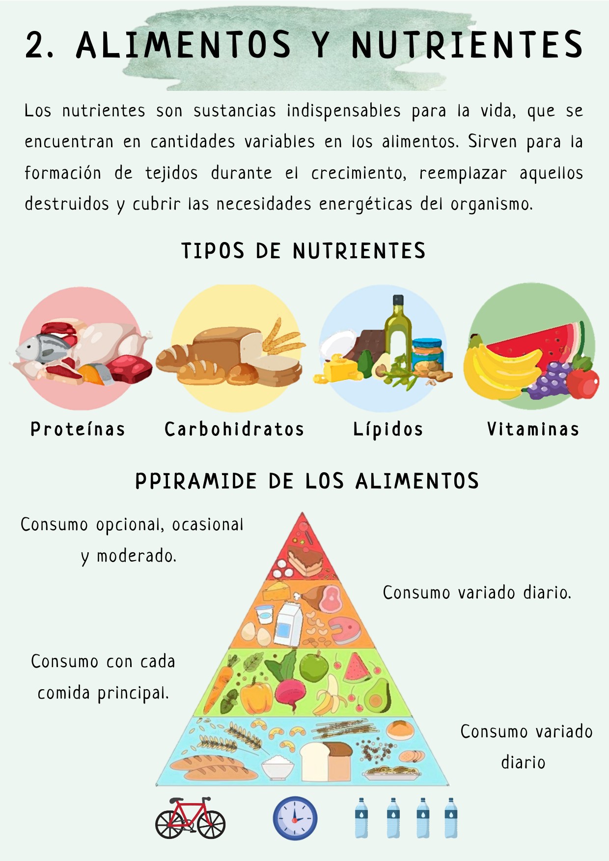 Los nutrientes son sustancias indispensables para la vida, que se encuentran en cantidades variables en los alimentos. Sirven para la formación de tejidos durante el crecimiento, reemplazar aquellos destruidos y cubrir las necesidades energéticas del organismo.