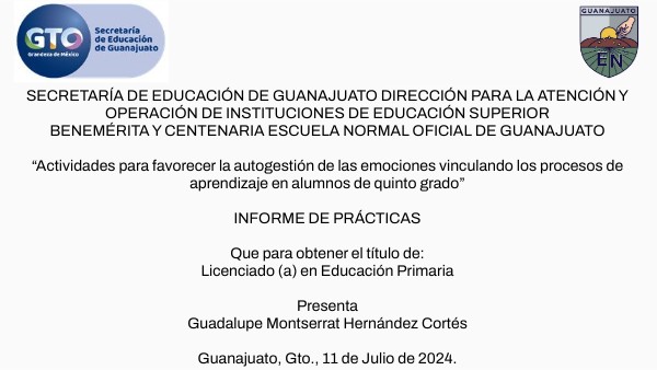 SECRETARÍA DE EDUCACIÓN DE GUANAJUATO DIRECCIÓN PARA LA ATENCIÓN Y OPERACIÓN DE INSTITUCIONES DE EDUCACIÓN SUPERIORBENEMÉRITA Y CENTENARIA ESCUELA NORMAL OFICIAL DE GUANAJUATO “Actividades para favorecer la autogestión de las emociones vinculando los procesos de aprendizaje en alumnos de quinto grado” INFORME DE PRÁCTICAS Que para obtener el título de: Licenciado (a) en Educación Primaria Presenta Guadalupe Montserrat Hernández Cortés Guanajuato, Gto., 11 de Julio de 2024.