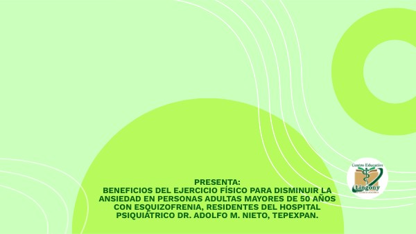 CENTRO EDUCATIVO LÍNGONY ALICIA ZARCO ANAYA LIC. FISIOTERAPIA 3º CUATRIMESTRE PROFESOR: L.N, MCs CASTILLO TEJEDA JONATHAN ALEJANDRO PRESENTA:BENEFICIOS DEL EJERCICIO FÍSICO PARA DISMINUIR LA ANSIEDAD EN PERSONAS ADULTAS MAYORES DE 44 AÑOS CON ESQUIZOFRENIA, RESIDENTES DEL HOSPITAL PSIQUIÁTRICO DR. ADOLFO M. NIETO, TEPEXPAN.