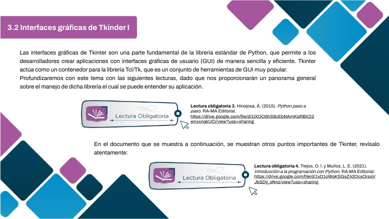 Las interfaces gráficas de Tkinter son una parte fundamental de la librería estándar de Python, que permite a los desarrolladores crear aplicaciones con interfaces gráficas de usuario (GUI) de manera sencilla y eficiente. Tkinter actúa como un contenedor para la librería Tcl/Tk, que es un conjunto de herramientas de GUI muy popular. Profundizaremos con este tema con las siguientes lecturas, dado que nos proporcionarán un panorama general sobre el manejo de dicha librería el cual se puede entender su aplicación.
