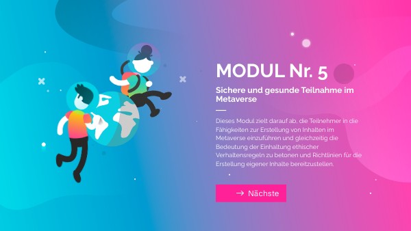 Willkommen zum ersten Szenario von Modul 5, in dem wir uns auf eine Reise begeben, um eine sichere und gesunde Teilnahme am Metaverse zu gewährleisten! In diesem Modul werden wir tief in die Feinheiten dieser virtuellen Welt eintauchen und dich mit dem nötigen Wissen ausstatten, damit du dich in dieser sich entwickelnden digitalen Landschaft sicher und nachhaltig bewegen kannst.