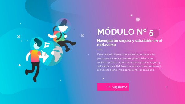 Este módulo tiene como objetivo educar a las personas sobre los riesgos potenciales y las mejores prácticas para una participación segura y saludable en el Metaverso. Abarca temas como el bienestar digital y las consideraciones éticas.