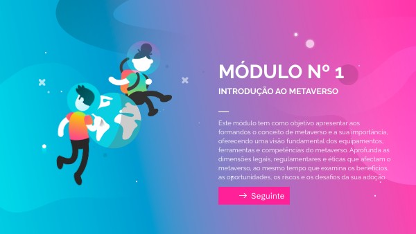 Bem-vindo ao primeiro cenário do Módulo 1, onde começaremos nossa jornada mergulhando fundo no coração do Metaverso! Neste módulo, vamos embarcar numa exploração cativante deste mundo virtual. Este cenário dar-lhe-á os conhecimentos fundamentais necessários para percorrer este novo ambiente desconhecido. Vamos, então, começar juntos esta fascinante viagem ao Metaverso!