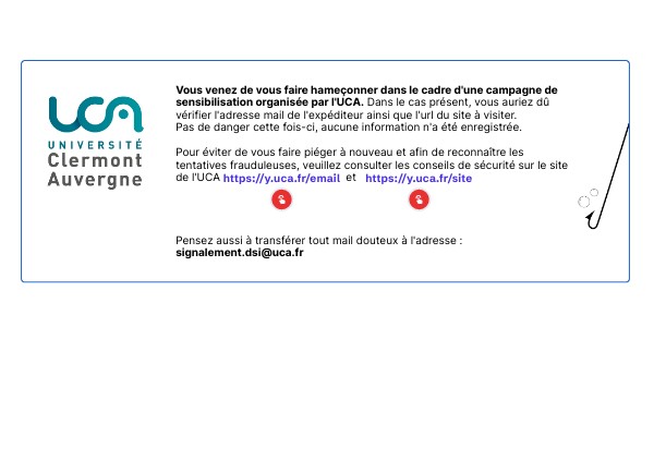 Vous venez de vous faire hameçonner dans le cadre d'une campagne de sensibilisation organisée par l'UCA. Dans le cas présent, vous auriez dû vérifier l'adresse mail de l'expéditeur ainsi que l'url du site à visiter. Pas de danger cette fois-ci, aucune information n'a été enregistrée. Pour éviter de vous faire piéger à nouveau et afin de reconnaître les tentatives frauduleuses, veuillez consulter les conseils de sécurité sur le site de l'UCA et Pensez aussi à transférer tout mail douteux à l'adresse : signalement.dsi@uca.fr