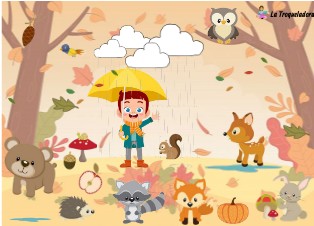 En otoño el viento sopla y empuja las nubes. Cuando las nubes se chocan, sueltan todas sus gotitas de agua y empieza a llover. Muchas gotitas de agua juntas en el suelo forman charcos.