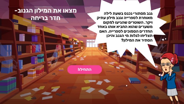 גנב מסתורי נכנס בשעת לילה מאוחרת לספרייה וגנב מילון עתיק ויקר. השוטרים שהגיעו למקום משערים שהוא החביא אותו באחד החדרים הסמוכים לספרייה. האם תצליחו לגלות מי הגנב והיכן הסתיר את המילון?