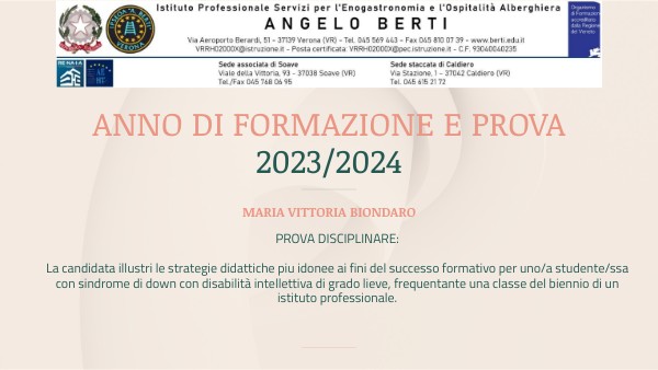 PROVA DISCIPLINARE:La candidata illustri le strategie didattiche piu idonee ai fini del successo formativo per uno/a studente/ssa con sindrome di down con disabilità intellettiva di grado lieve, frequentante una classe del biennio di un istituto professionale.