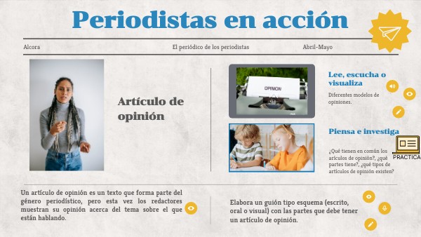 Elabora un guión tipo esquema (escrito, oral o visual) con las partes que debe tener un artículo de opinión.