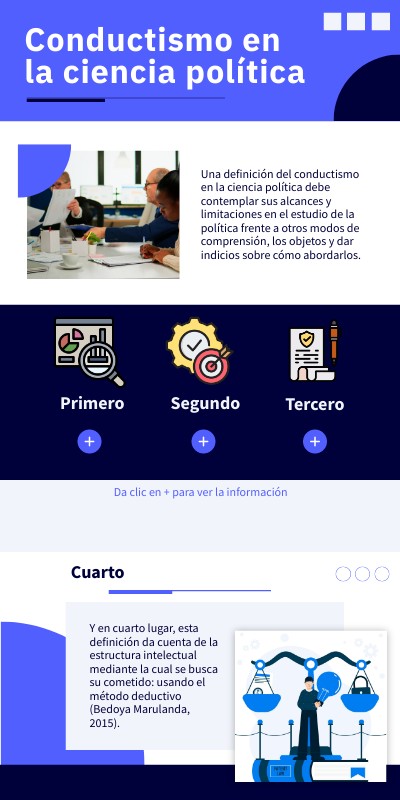 - En tercer lugar, la definición señala la intención de señalar las reglas con las que se aborda su objeto. En este sentido, el conductismo es la forma en que se estudian los hechos relacionados con el comportamiento político mediante herramientas que ayuden a la recolección, sistematización e interpretación de estos; aquí se cuenta la construcción de conceptos empíricos y las técnicas de tratamiento de datos.