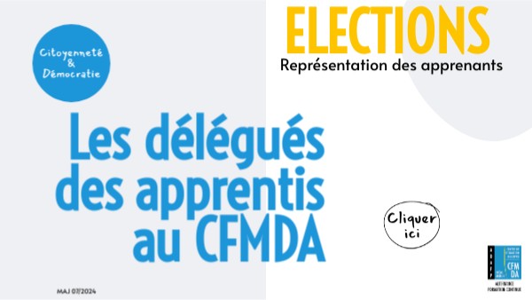Le centre de formation existe pour former de futurs artisans. Ces apprenants sont les plus à même de faire remonter des idées ou des retours d'information aux équipes du CFMDA afin de le faire progresser dans sa démarche permanente d'amélioration. Les délégués sont les personnes choisies et élues par leurs pairs pour porter leur voix auprès des responsables du CFMDA. Présentez-vous aux élections ou élisez le candidat qui vous représentera le mieux !