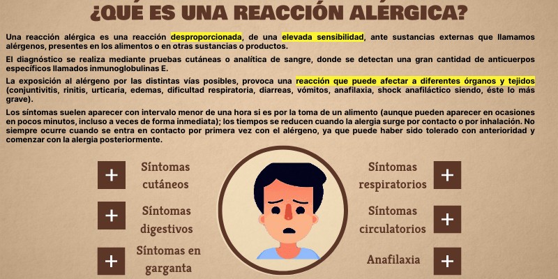 Una reacción alérgica es una reacción desproporcionada, de una elevada sensibilidad, ante sustancias externas que llamamos alérgenos, presentes en los alimentos o en otras sustancias o productos. El diagnóstico se realiza mediante pruebas cutáneas o analítica de sangre, donde se detectan una gran cantidad de anticuerpos específicos llamados inmunoglobulinas E. La exposición al alérgeno por las distintas vías posibles, provoca una reacción que puede afectar a diferentes órganos y tejidos (conjuntivitis, rinitis, urticaria, edemas, dificultad respiratoria, diarreas, vómitos, anafilaxia, shock anafiláctico siendo, éste lo más grave). Los síntomas suelen aparecer con intervalo menor de una hora si es por la toma de un alimento (aunque pueden aparecer en ocasiones en pocos minutos, incluso a veces de forma inmediata); los tiempos se reducen cuando la alergia surge por contacto o por inhalación. No siempre ocurre cuando se entra en contacto por primera vez con el alérgeno, ya que puede haber sido tolerado con anterioridad y comenzar con la alergia posteriormente.