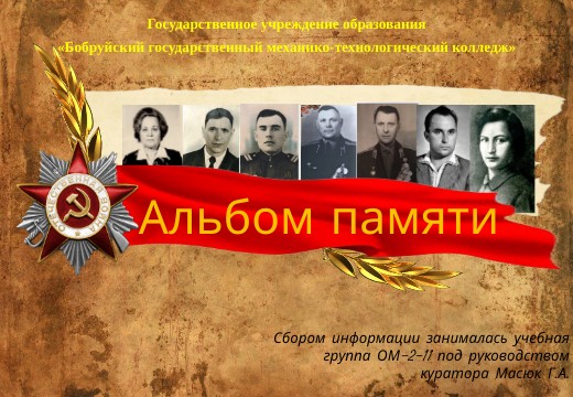 Учащиеся и педагоги Бобруйского государственного механико-технологического колледжа, вспоминая своих близких, специально оставляют этот альбом открытым: каждый желающий может добавить в него сведения о своем родственнике. Мы призываем подхватить инициативу, и пусть количество страниц в этом альбоме растёт. Ведь их так мало осталось, очевидцев Великой Победы. Наш долг – сохранить память о них и передать потомкам, чтобы никто не смел ставить под сомнение подвиг и жертву миллионов павших в той жестокой праведной битве... Битве во имя мирного неба над нашими головами, во имя будущего, в котором каждый из нас волен выбирать свой путь, во имя веры, любви и дружбы – тех безвременных ценностей, которые лежат в основе самой