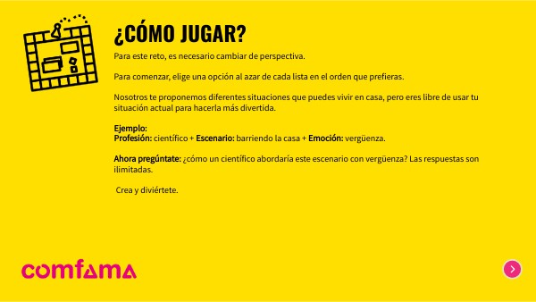 Para este reto, es necesario cambiar de perspectiva. Para comenzar, elige una opción al azar de cada lista en el orden que prefieras. Nosotros te proponemos diferentes situaciones que puedes vivir en casa, pero eres libre de usar tu situación actual para hacerla más divertida. Ejemplo: Profesión: científico + Escenario: barriendo la casa + Emoción: vergüenza. Ahora pregúntate: ¿cómo un científico abordaría este escenario con vergüenza? Las respuestas son ilimitadas. Crea y diviértete.