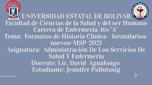 UNIVERSIDAD ESTATAL DE BOLIVAR Facultad de Ciencias de la Salud y del ser Humano Carrera de Enfermería 4to "A" Tema: Formatos de Historia Clínica - formularios-nuevos-MSP-2021 Asignatura: Administración De Los Servicios De Salud Y Enfermería Docente: Lic. David Agualongo Estudiante: Jennifer Pullutasig