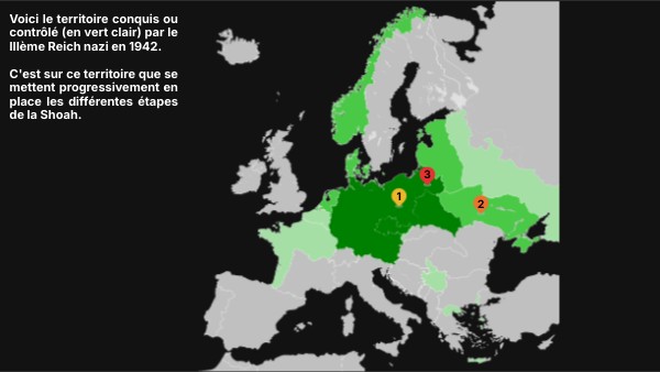 Voici le territoire conquis ou contrôlé (en vert clair) par le IIIème Reich nazi en 1942. C'est sur ce territoire que se mettent progressivement en place les différentes étapes de la Shoah.