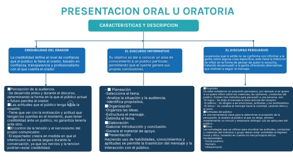 - ■ Planeación -Selecciona el tema. -Analiza la situación y la audiencia. -Identifica propósitos. ■Organización -Organiza las ideas. -Estructura el mensaje. -Delimita el tema. ■Elaboración -Elaborar introducción y conclusión. -Genera el material de apoyo. ■Presentación Haciendo uso de habilidades, conocimientos y aptitudes se permite la trasmicion del mensaje y la interacción con el público.