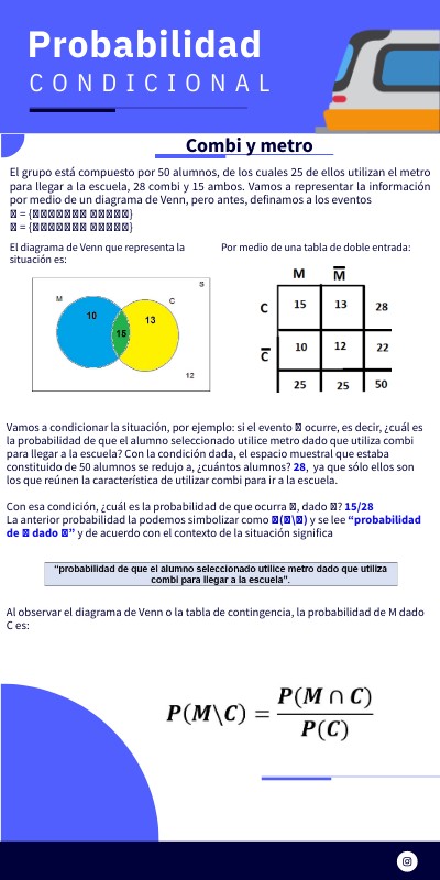 Aprendizaje: Construye la expresión para el cálculo de la probabilidad condicional entre dos eventos, a partir de la información contenida en una tabla de contingencia. El grupo está compuesto por 50 alumnos, de los cuales 25 de ellos utilizan el metro para llegar a la escuela, 28 combi y 15 ambos. Vamos a representar la información por medio de un diagrama de Venn, pero antes, definamos a los eventos 𝑀 = {𝑈𝑡𝑖𝑙𝑖𝑐𝑒 𝑚𝑒𝑡𝑟𝑜} 𝐶 = {𝑈𝑡𝑖𝑙𝑖𝑐𝑒 𝑐𝑜𝑚𝑏𝑖}
