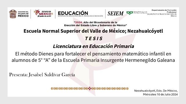 Escuela Normal Superior del Valle de México; Nezahualcóyotl T E S I S Licenciatura en Educación Primaria El método Dienes para fortalecer el pensamiento matemático infantil en alumnos de 5° “A” de la Escuela Primaria Insurgente Hermenegildo Galeana