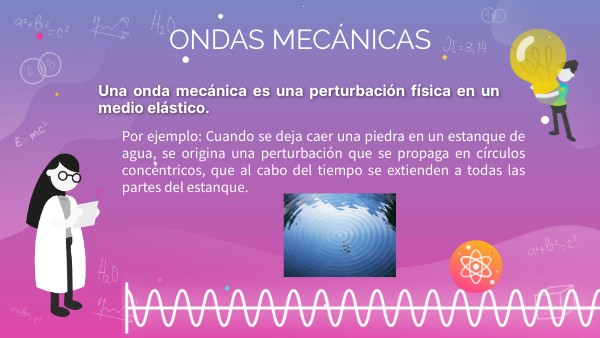 Por ejemplo: Cuando se deja caer una piedra en un estanque de agua, se origina una perturbación que se propaga en círculos concéntricos, que al cabo del tiempo se extienden a todas las partes del estanque.