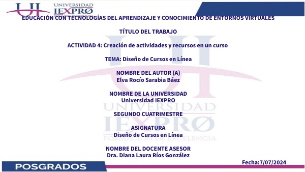 EDUCACIÓN CON TECNOLOGÍAS DEL APRENDIZAJE Y CONOCIMIENTO DE ENTORNOS VIRTUALES TÍTULO DEL TRABAJO ACTIVIDAD 4: Creación de actividades y recursos en un curso TEMA: Diseño de Cursos en Línea NOMBRE DEL AUTOR (A) Elva Rocío Sarabia Báez NOMBRE DE LA UNIVERSIDAD Universidad IEXPRO SEGUNDO CUATRIMESTRE ASIGNATURA Diseño de Cursos en Línea NOMBRE DEL DOCENTE ASESOR Dra. Diana Laura Ríos González Fecha:7/07/2024