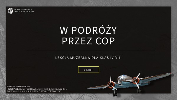 1. Przed każdym z zadań zapoznaj się z materiałem edukacyjnym w formie teksu, filmu lub zdjęć. Znajdziesz to zwiedzając Wirtualne Muzeum COP. Tam będą również ukryte podpowiedzi w multimedialnych znacznikach.2. Wróć do zadania i zaznacz odpowiedną odpowiedź.3. Po jej wypełnieniu zostaniesz przeniesiony do kolejnego zadania.4. Z każdego poziomu zawsze możesz wrócić do Wirtualnego Muzeum.5. Po poprawnym rozwiązaniu wszystkich zadań otrzymasz dyplom ukończenia lekcji.Interaktywne elementy zazwyczaj oznaczone są kolorem zielonym.POWODZENIA