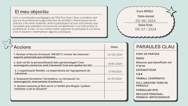 Com a docent de l'àmbit plurilíngüe i tenint 3 companyes més fent el curs traslladarem a la resta de companys les mesures que ja fem i les sistematizarem com a àmbit. Coses que no feia de manera regular les faré. (Objectiu 24-25) Com a coordinadora pedagògica promouré aquest moviment a tot el claustre.