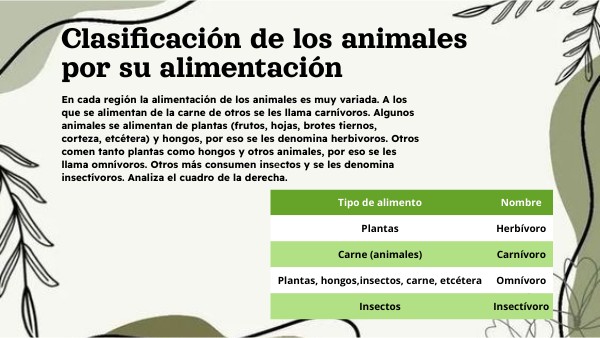 En cada región la alimentación de los animales es muy variada. A los que se alimentan de la carne de otros se les llama carnívoros. Algunos animales se alimentan de plantas (frutos, hojas, brotes tiernos, corteza, etcétera) y hongos, por eso se les denomina herbivoros. Otros comen tanto plantas como hongos y otros animales, por eso se les llama omnívoros. Otros más consumen insectos y se les denomina insectívoros. Analiza el cuadro de la derecha.