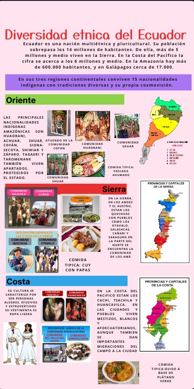 Ecuador es una nación multiétnica y pluricultural. Su población sobrepasa los 14 millones de habitantes. De ella, más de 5 millones y medio viven en la Sierra. En la Costa del Pacífico la cifra se acerca a los 6 millones y medio. En la Amazonía hay más de 600.000 habitantes, y en Galápagos cerca de 17.000.