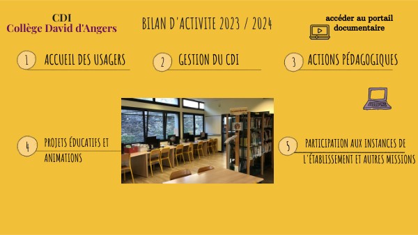 - accueil des élèves sur quatre jours : lundi (8h - 12h05 / 12h45 - 17h) mardi (9h - 12h05 / 12h45 - 17h) jeudi (9h - 12h05 / 12h45 - 17h) vendredi (8h -12h05 / 12h45 - 16h) Mme Guérin, professeure documentaliste titulaire, gère le Centre de Documentation et d’Information. 7 postes informatiques pour les élèves, afin de consuler le portail documentaire, faire des recherches sur le web, mettre en page des documents.Depuis cette année, le collège dispose d'un équipement de webradio.Les élèves se rendent au CDI durant la pause méridienne de 12h45 à 13h45 sur inscription.