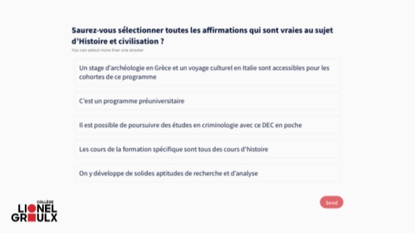 Histoire et civilisation est tout en action avec son stage en Grèce et son voyage culturel en Italie, tous deux facultatifs. À ces expériences s’ajoutent de nombreuses sorties culturelles tout au long de ce parcours préuniversitaire. Les personnes qui choisissent ce programme développent d’importantes aptitudes en recherche et analyse, ce qui constitue certainement un atout en prévision de l’université et du marché du travail. En ajoutant un préalable en méthodes quantitatives, la criminologie est effectivement une option universitaire pour les cohortes diplômées de ce programme. Les cours de formation spécifique portent sur des domaines aussi variés que les arts, les sciences, la sociologie et la géographie. Bien qu’ils ne soient pas des cours d’histoire, on doit cependant s’attendre à ce qu’ils aient tous une tangente historique.