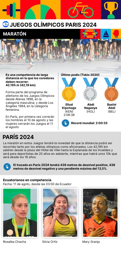 Es una competencia de larga distancia en la que los coredores deben recorrer: 42.195 m (42,19 km) Forma parte del programa de atletismo de los Juegos Olímpicos desde Atenas 1896, en la categoría masculina; y desde Los Ángeles 1984, en la categoría femenina. En París, por primera vez correrán los hombres el 10 de agosto y las mujeres cerrarán los Juegos el 11 el agosto
