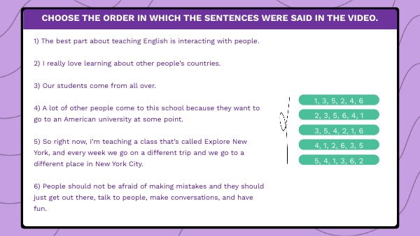 1) The best part about teaching English is interacting with people. 2) I really love learning about other people’s countries. 3) Our students come from all over. 4) A lot of other people come to this school because they want to go to an American university at some point. 5) So right now, I’m teaching a class that’s called Explore New York, and every week we go on a different trip and we go to a different place in New York City. 6) People should not be afraid of making mistakes and they should just get out there, talk to people, make conversations, and have fun.