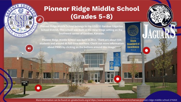 Pioneer Ridge Middle School belongs to the USD231 Gardner Edgerton School District. This school was built in the rural fringe setting on the Southwest corner of Gardner, Kanasas. Pioneer Ridge Middle School was built in 2011. There are about 550 students and around 46 full-time teachers. Check out more information about PRMS by clicking on the buttons around this image!