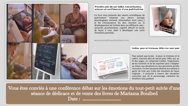 Vous êtes conviés à une conférence débat sur les émotions du tout-petit suivie d'une séance de dédicace et de vente des livres de Mariama Bouibed Date : .................................
