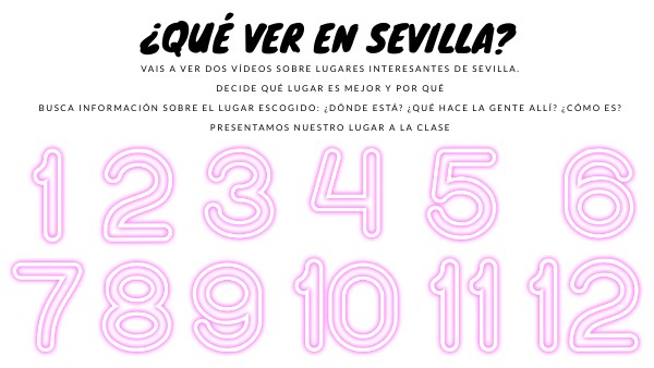 Vais a ver dos vídeos sobre lugares interesantes de Sevilla. Decide qué lugar es mejor y por qué Busca información sobre el lugar escogido: ¿Dónde está? ¿Qué hace la gente allí? ¿Cómo es? Presentamos nuestro lugar a la clase