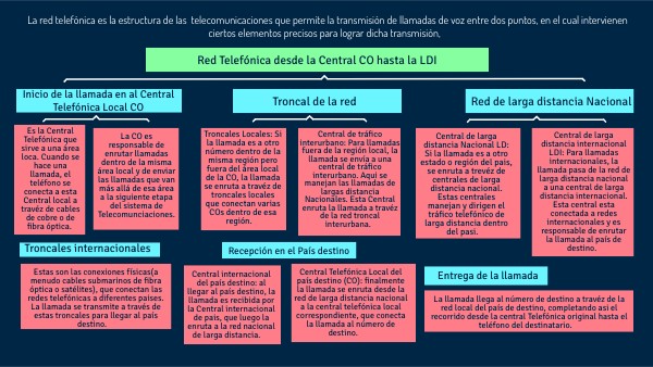 Central de larga distancia internacional LDI: Para llamadas internacionales, la llamada pasa de la red de larga distancia nacional a una central de larga distancia internacional. Esta central esta conectada a redes internacionales y es responsable de enrutar la llamada al país de destino.