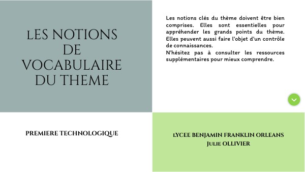 Les notions clés du thème doivent être bien comprises. Elles sont essentielles pour appréhender les grands points du thème. Elles peuvent aussi faire l'objet d'un contrôle de connaissances. N'hésitez pas à consulter les ressources supplémentaires pour mieux comprendre.