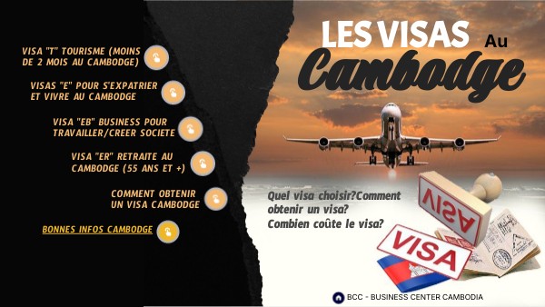 - Demander en ligne, un VISA pour entrer au Cambodge. Obtention en 3 jours. Vous avez 2 choix de Visas : 1- Visa tourist (30$), 2- Visa E (35$). Demander son e-VisaUne fois entré sur le territoire, la validité de ce Visa sera d'1 mois. Durant ce mois, pour le VISA E, BCC vous fait votreVISA BUSINESS ou VISA RETRAITE long terme.- Si vous arrivez par avion, vous devez vous enregistrer 1 semaine avant votre départ, surl'application "e-Arrival"
