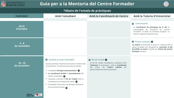La tutoria d'universitat es posa en contacte amb el centre formador per presentar-se, concretar el dia d'acollida al centre i també els criteris del procés formatiu al centre.