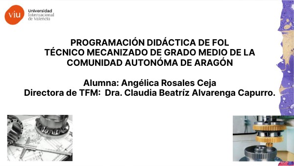 PROGRAMACIÓN DIDÁCTICA DE FOL TÉCNICO MECANIZADO DE GRADO MEDIO DE LA COMUNIDAD AUTONÓMA DE ARAGÓN Alumna: Angélica Rosales Ceja Directora de TFM: Dra. Claudia Beatríz Alvarenga Capurro.
