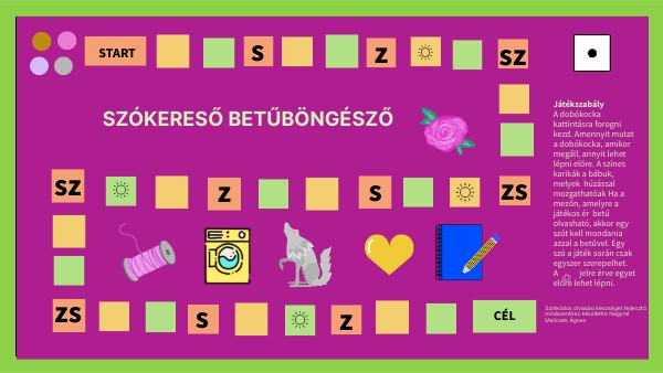 Játékszabály A dobókocka kattintásra forogni kezd. Amennyit mutat a dobókocka, amikor megáll, annyit lehet lépni előre. A színes karikák a bábuk, melyek húzással mozgathatóak Ha a mezőn, amelyre a játékos ér betű olvasható, akkor egy szót kell mondania azzal a betűvel. Egy szó a játék során csak egyszer szerepelhet. A jelre érve egyet előre lehet lépni.